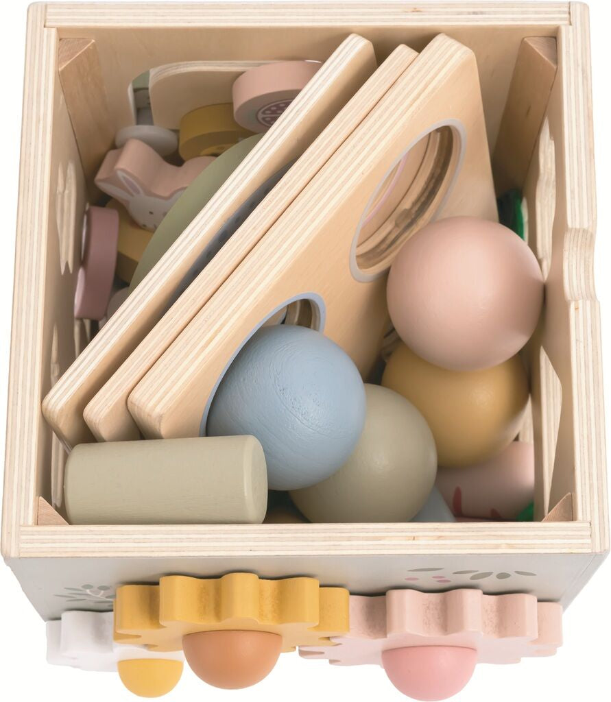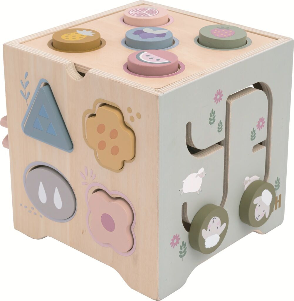 Počas hry sa deti učia rozpoznávať základné tvary, farby aj zvieratká. Všetky diely je možné uložiť vo vnútri kocky, takže po hraní zostáva všetko pohromade a nič sa nestratí. Vďaka jemným pastelovým farbám a roztomilým ilustráciám zvieratiek je hračka nielen atraktívna a zábavná, ale je aj pekným doplnkom detskej izbičky či herne.